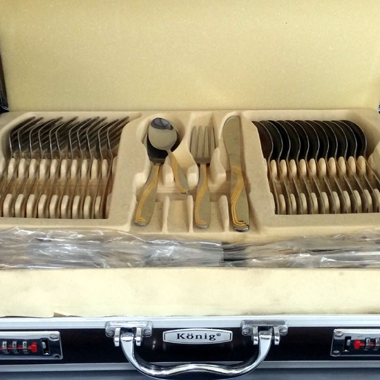 Komplet escajga Konig koji je pred vama izrađen je od sjajnog, visokopoliranog i oplemenjenog čelika inox 18/10 debljine 2.5mm, dok su drške ukrasno izrezbarene. Nalazi se u luksuznom pakovanju, tj. akt torbi koju dobijate na poklon. Komplet je namenjen za 12 osoba. Sastoji se od 72 elemenata: kašika, viljušaka, malih kašika, oblih noževa i raznog pribora.