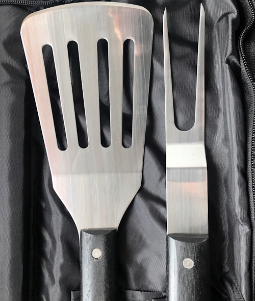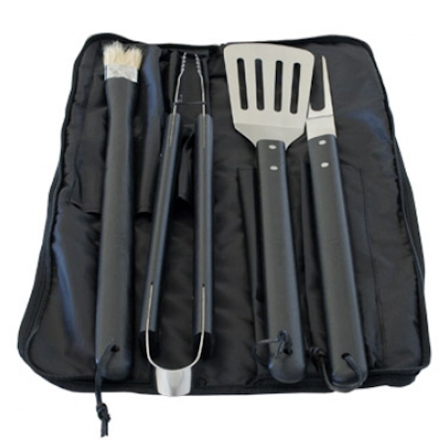 U kompletu se nalaze : univerzalna grill hvataljka (špatula), lopatica za okretanje mesa, velika viljuška, četka za mazanje i čišćenje roštilja, kao i praktična torba za odlaganje. Dužina pribora je čak 50cm.